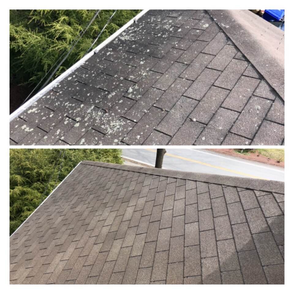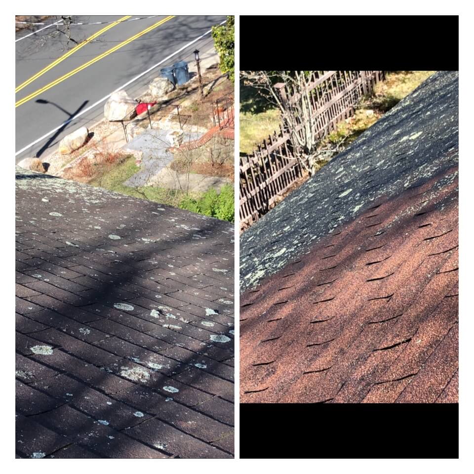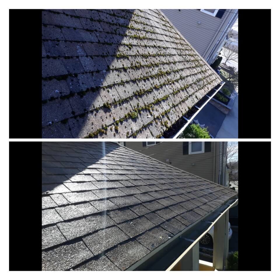 HiCleaners is the most experienced company in Framingham, MA that deals with roof washing and roof soft washing. All of our employees are trained to recognize precise solution mixing ratios to provide you with the safest and most effective soft washing service. Roofs are a commonly neglected part of a house due to the fact that most people don’t have ladders to access it, so it is very easy to just leave it alone and forget about problems that may start to arise. Just like many home owners, discoloration and small bits of moss on a roof can be overlooked because of the misconception that it is just aesthetic. However, it isn’t just aesthetic, the moss slowly lifts the granules off the shingles which in turn shorten the life of the shingle. The moss also spreads, just like any bacteria if it is left alone for too long, it can quickly become a problem that spirals out of control. Call HiCleaners for a free quote, we only use the most advanced eco-friendly solutions and equipment to make sure the job is done right, for the safety of the employees, your plants, grass, pets, and children.
